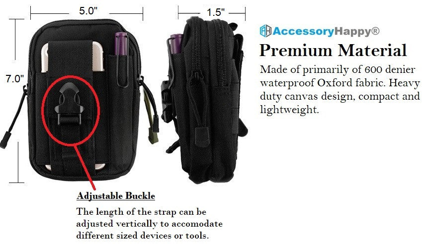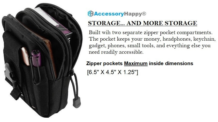 AccessoryHappy branded rugged canvas Vertical case is made of high quality canvas with a great and stylish looking. Two large zipper pockets compartments are design provide enough room to carry your phone(under 6.5") as well as keys, wall charger, headphones, ID cards and cash. The adjustable flap also ideal storage for utility items and small tools.