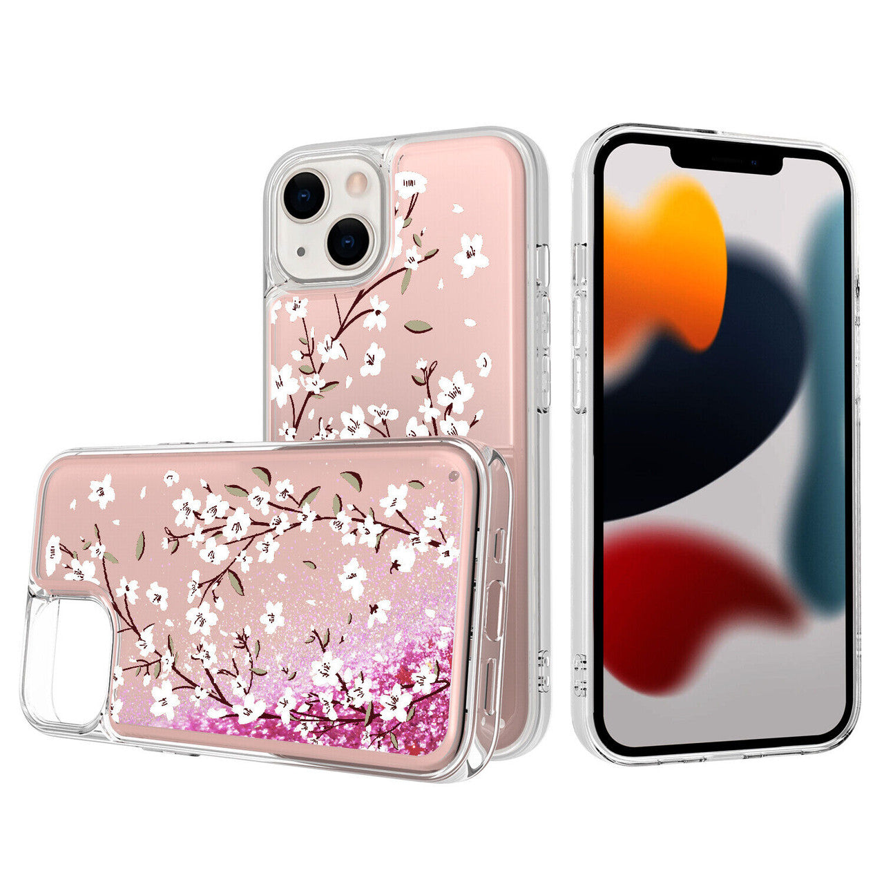 iPhone 14 Glitter Phone Case Girly Women Bling Sparkle Luxury Flowing Floating Quicksand Waterfall Clear Soft TPU Case Cover - Pink Floral