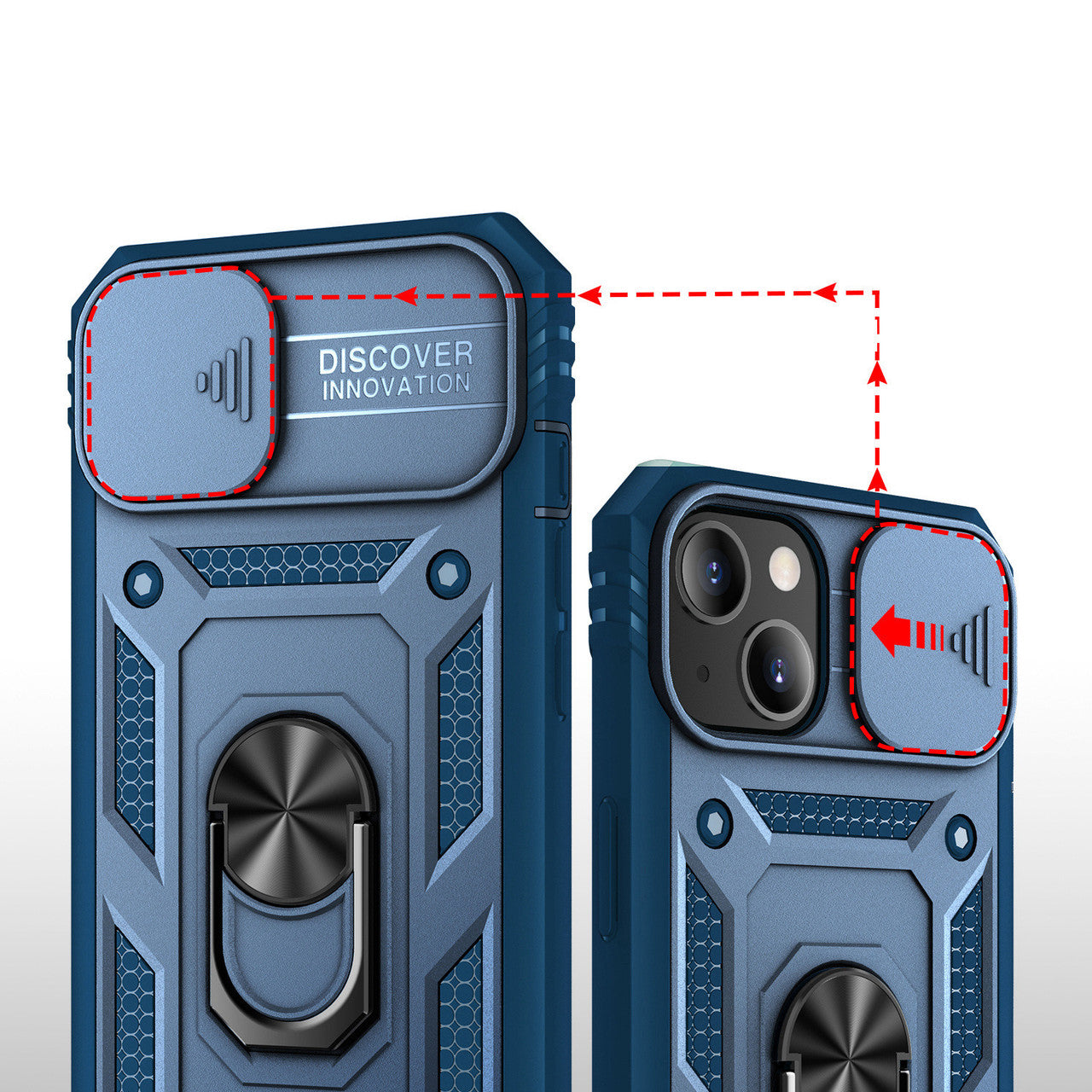 iPhone 14 Case with Camera Cover & Kickstand, Built-in 360°Rotate Ring Stand with Camera Lens Protection Magnetic Magnet Protective Phone Case - Navy Blue